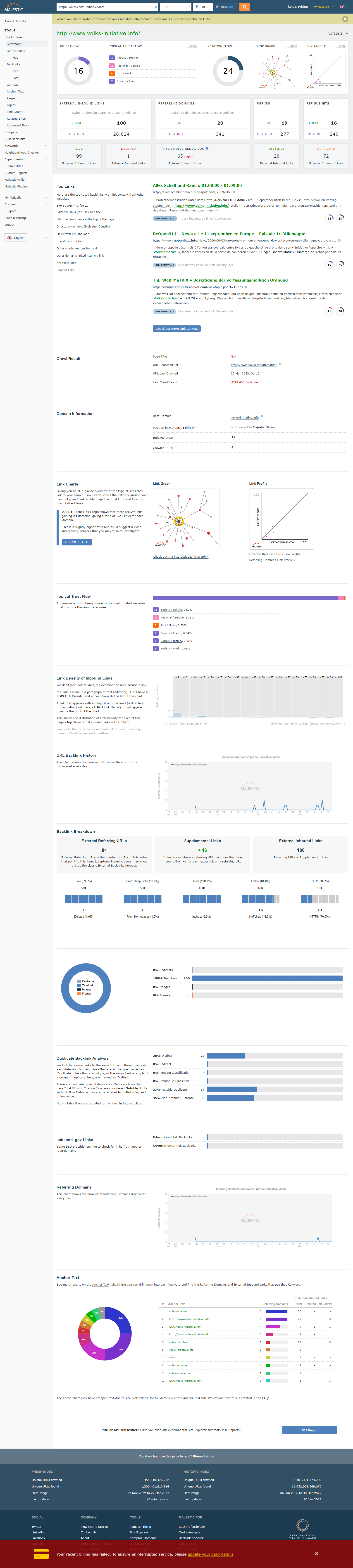 SEOMoz DA/PAMajestic TF/CF Ahrefs DR/UR Total BacklinksReferring IPsReferring DomainsTrust BLFirst WA Record