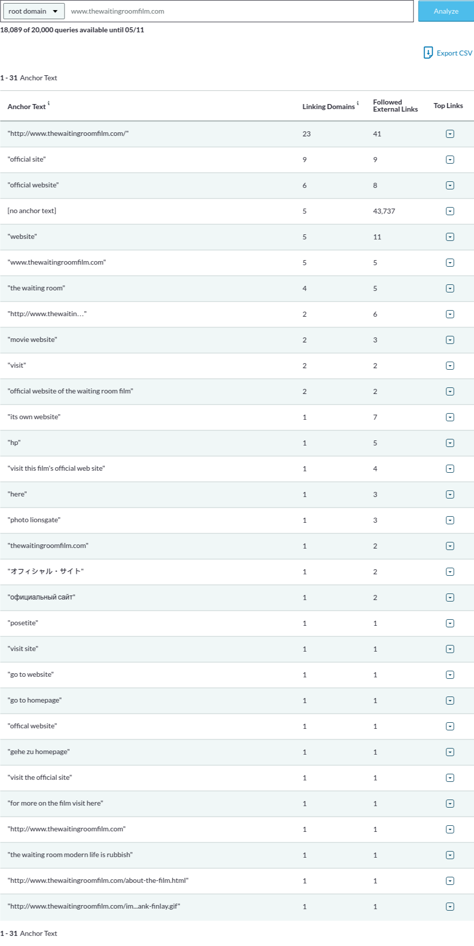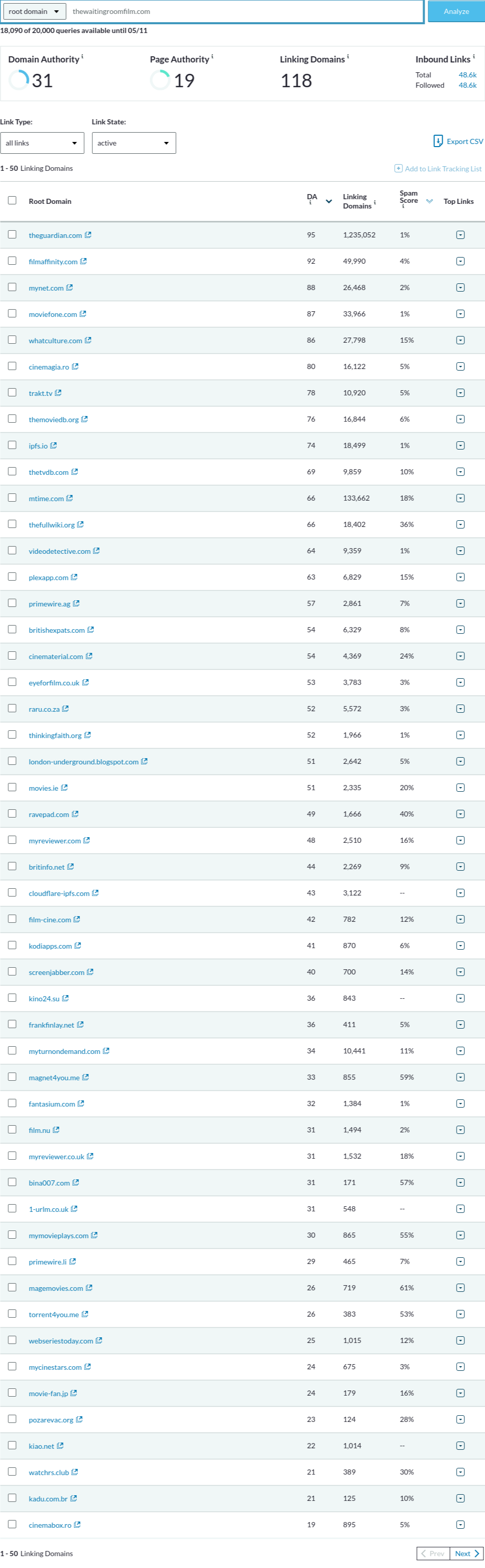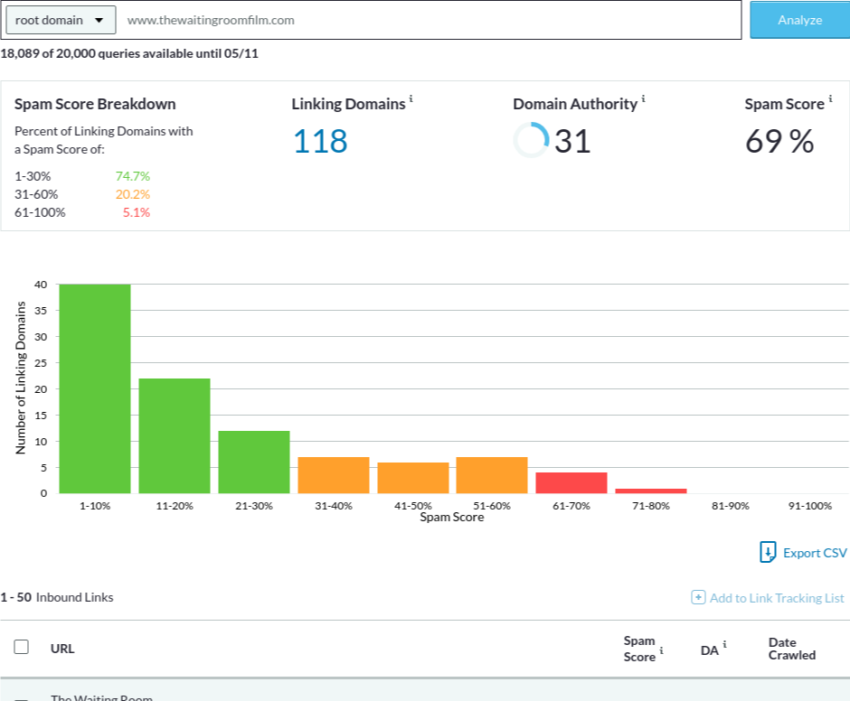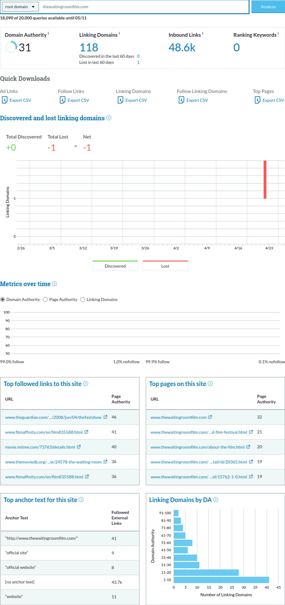 SEOMoz DA/PA | Majestic TF/CF | Ahrefs DR/UR | Total Backlinks | Referring IPs | Referring Domains | Trust BL | First WA Record |